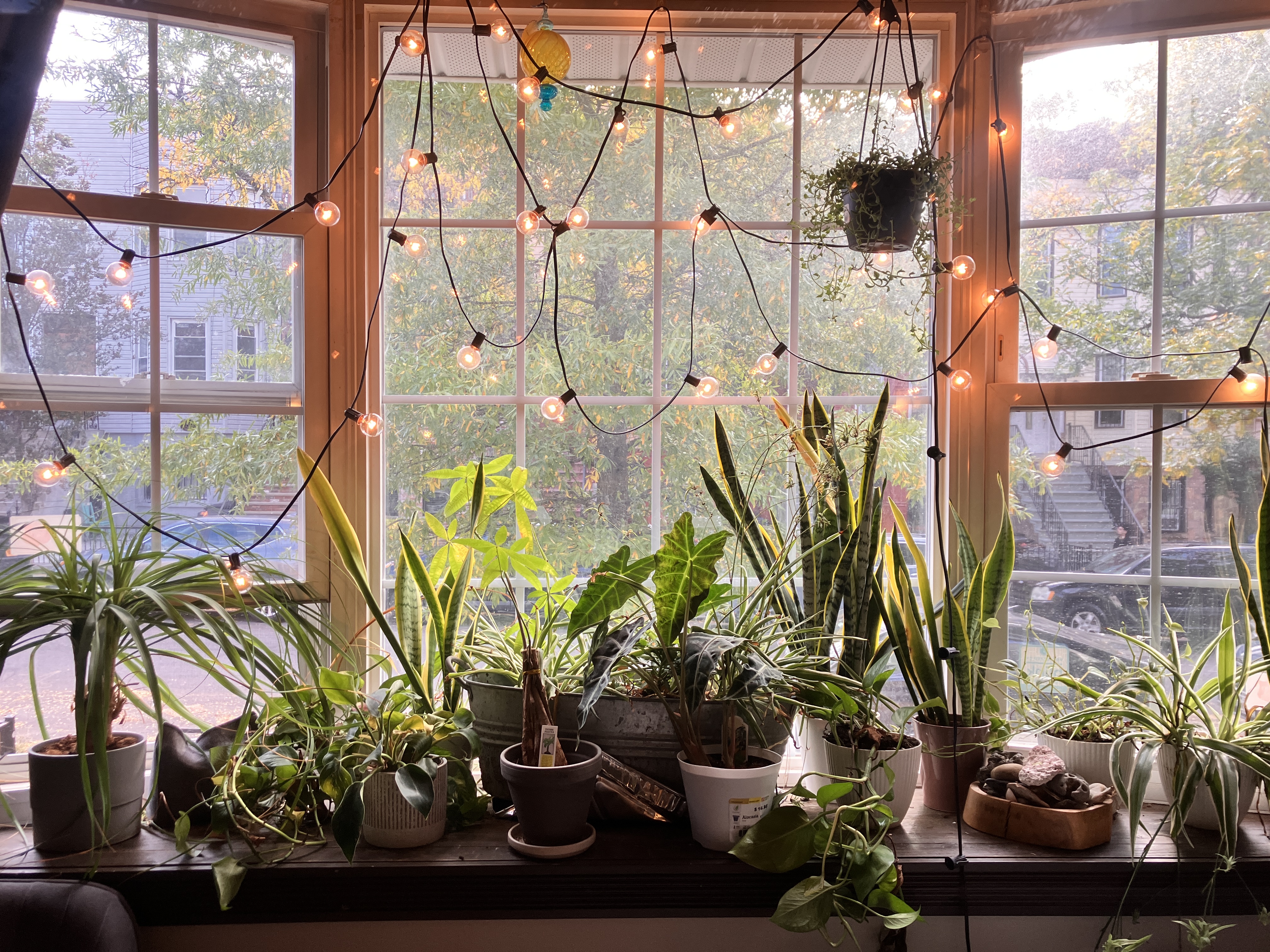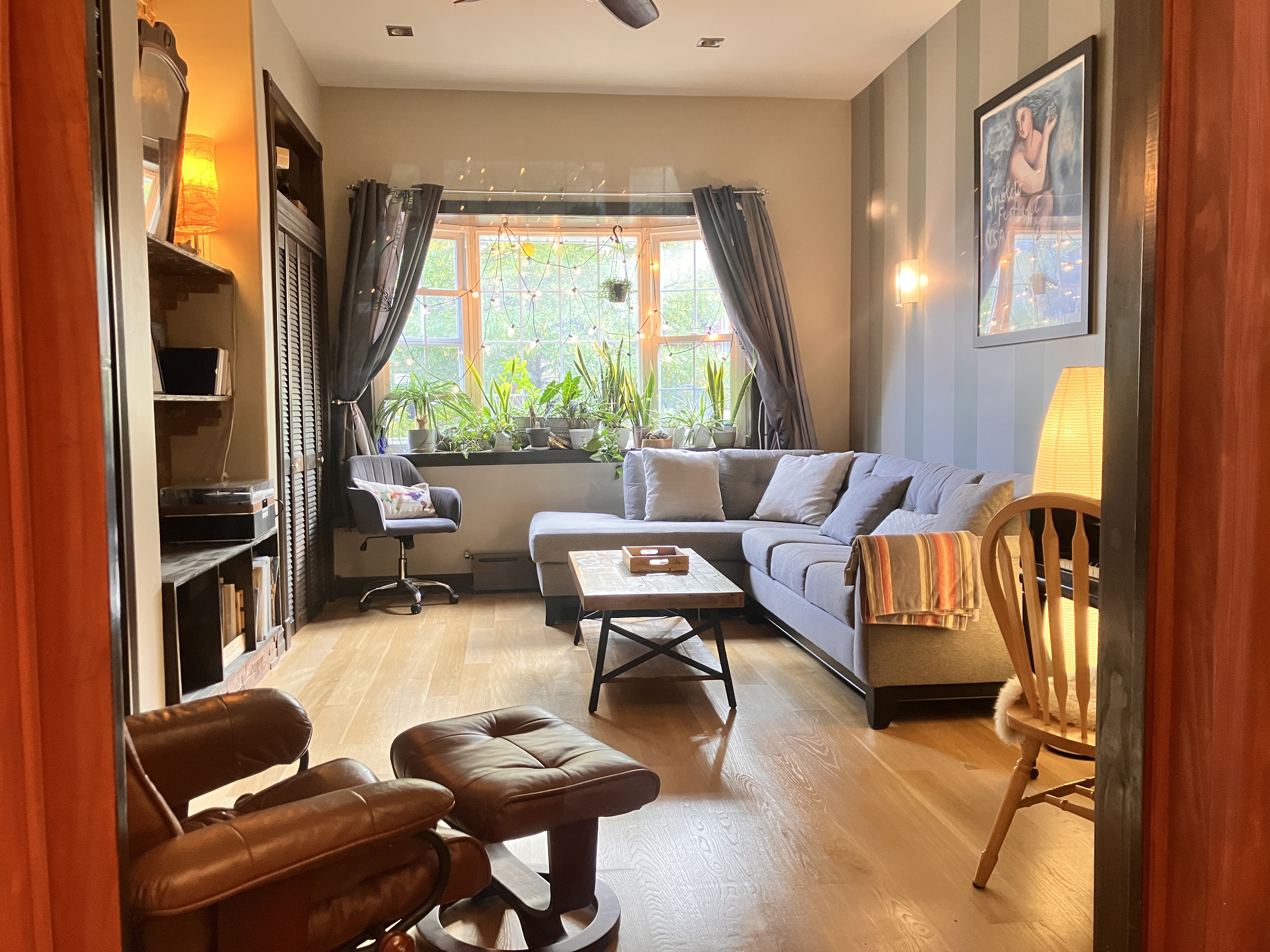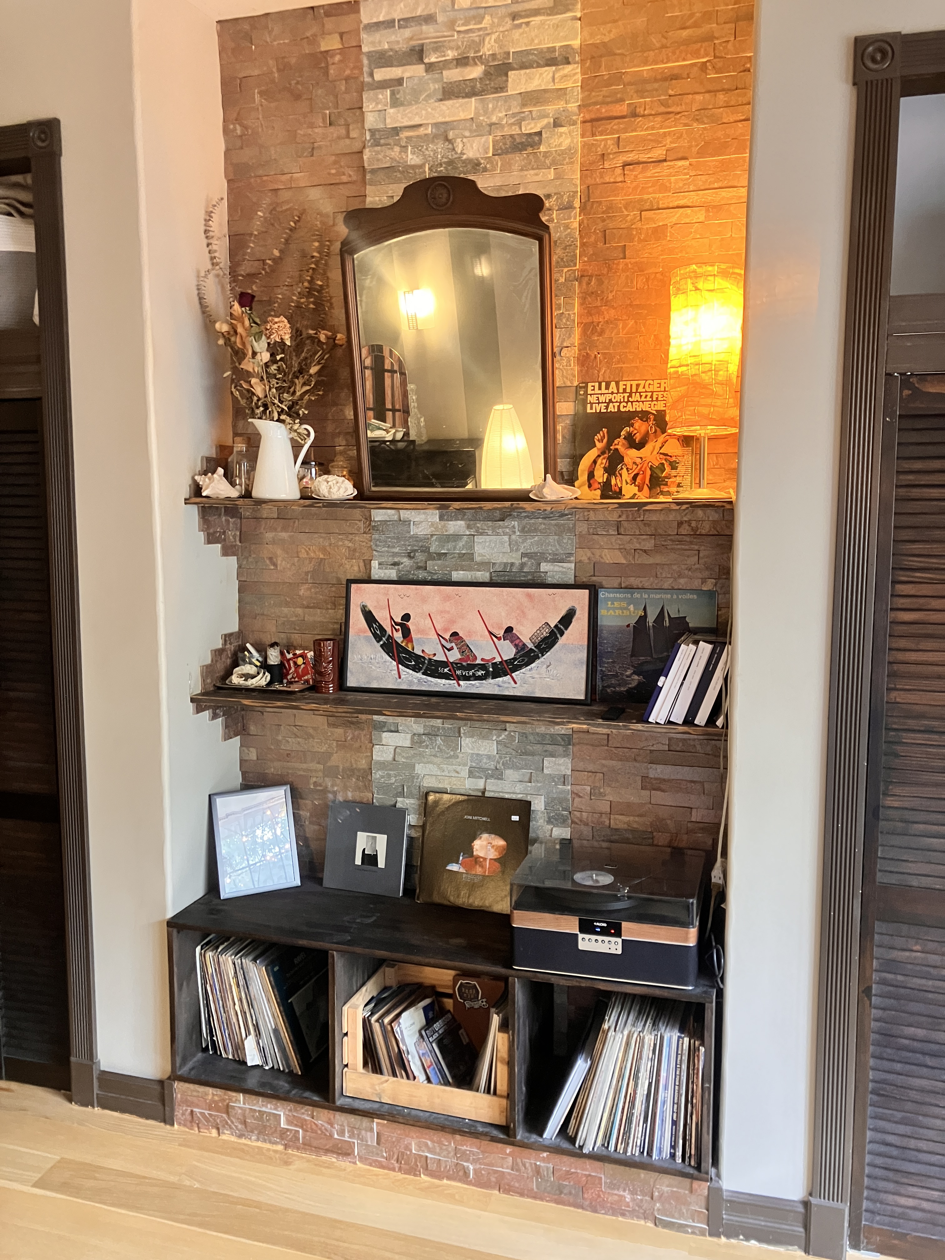 Salon avec une tres grande fenêtre donnant sur une rue calme, avec grand canapé d’angle, un piano, un lecteur de vinyles et notre collection qui va avec. Il y a aussi un dressing et un bureau caché dans le deuxième.