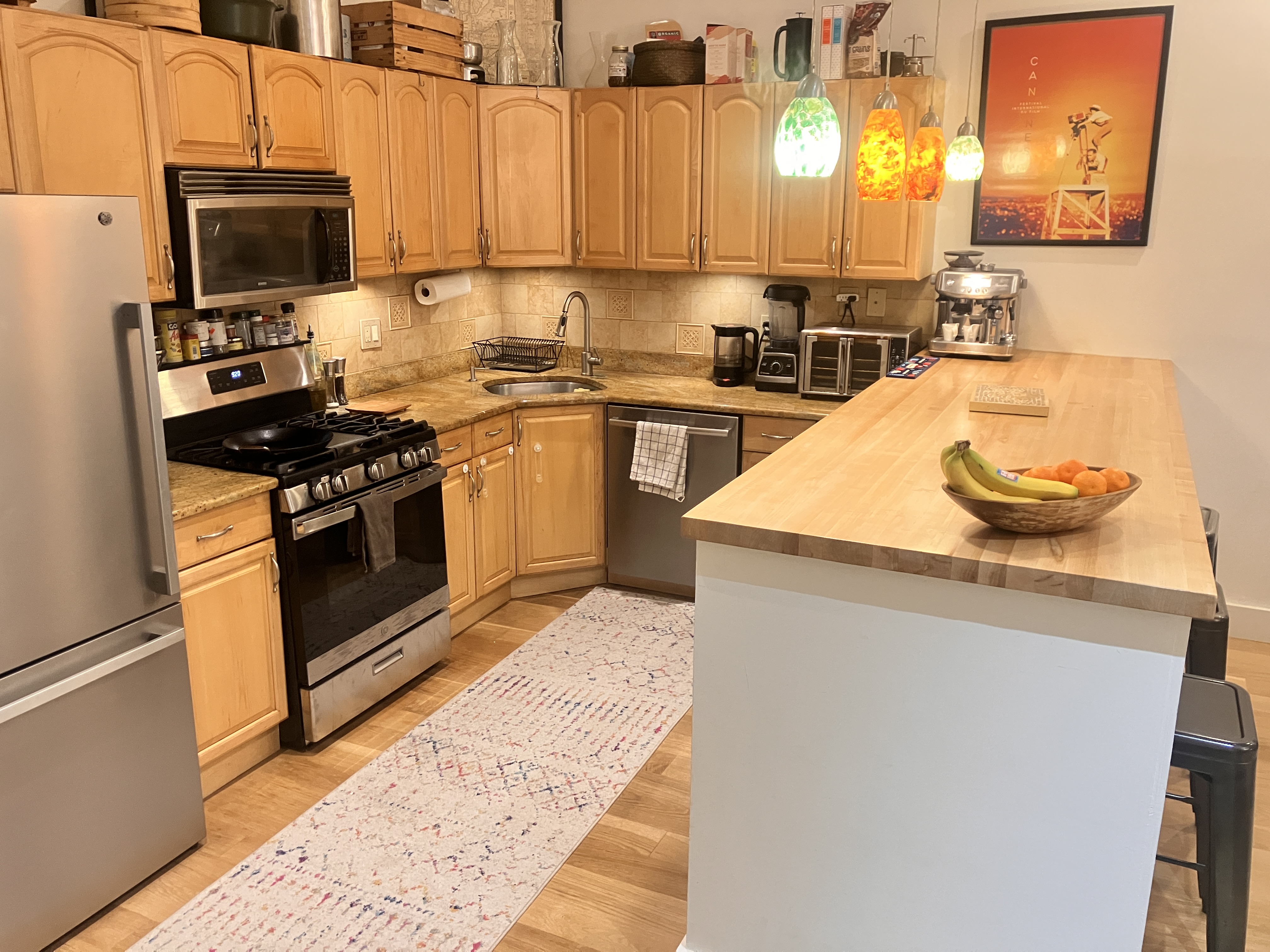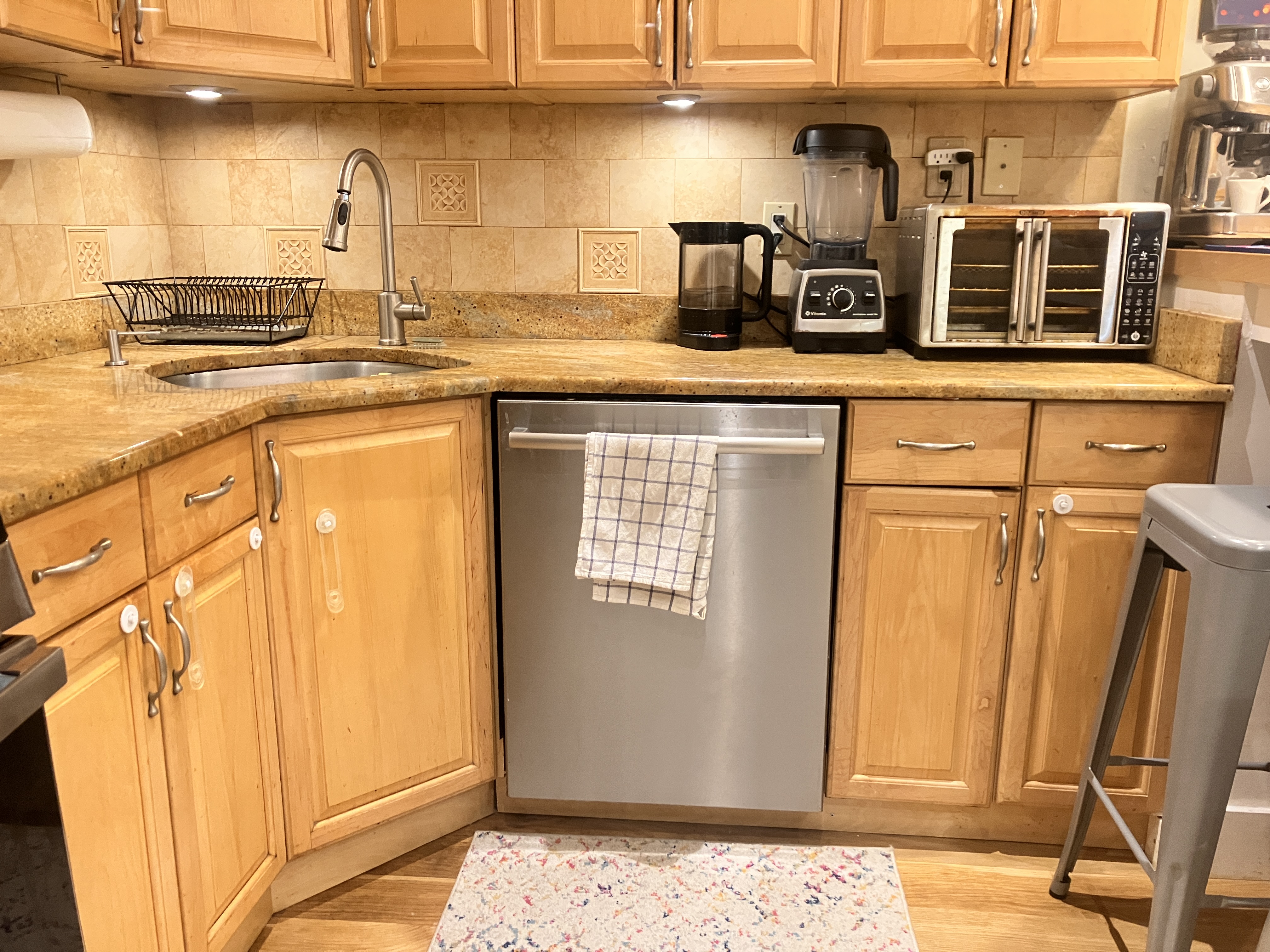 -Kitchen includes a 5 burner stove, dishwasher, microwave, air fryer / toaster oven, espresso machine and other coffee makers, electric kettle, blender, Soda Stream